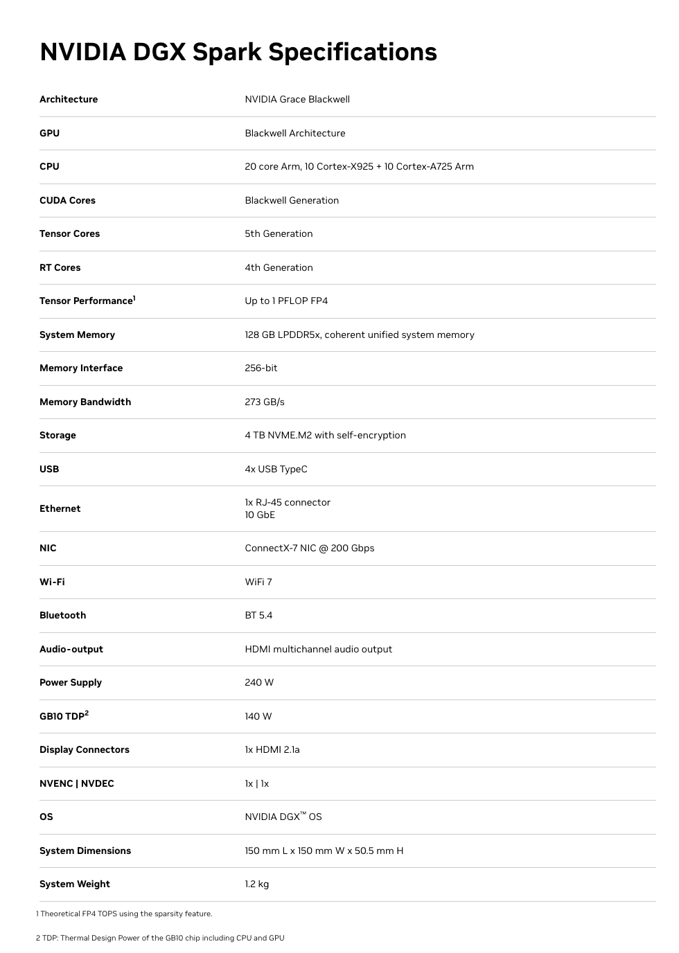 - Up to 1 PFLOP of FP4 AI compute (with structured sparsity — the caveat matters)
